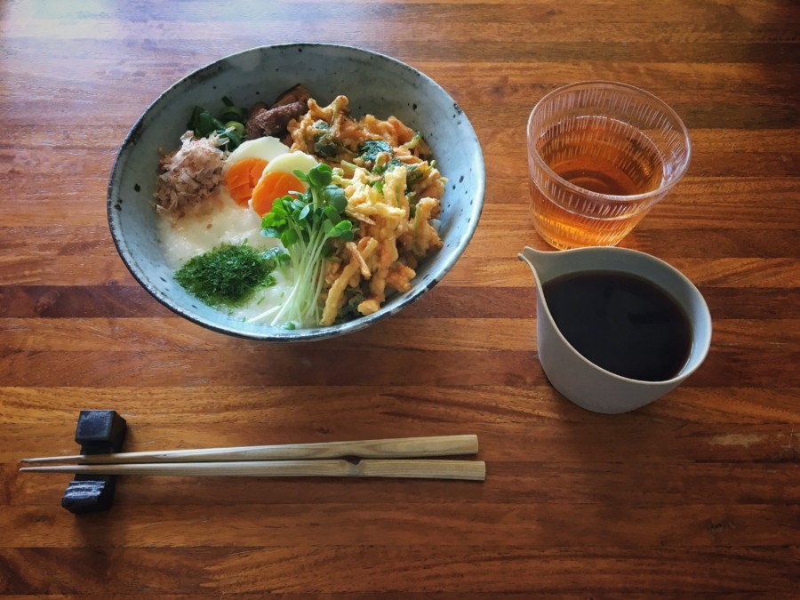 新ジャガと桜エビ、三つ葉のかき揚げとシイタケの天ぷら、山芋とろろ、そしてたまご。