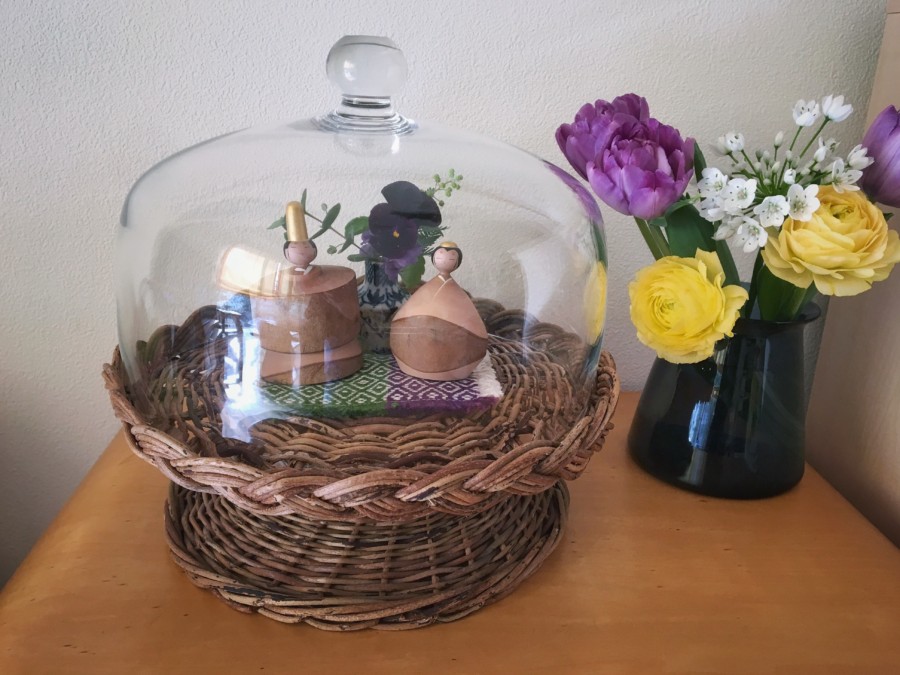 立春、kegoyaさんのアケビのスタンドとガラスドームに出雲のおひなさまを飾りました。 今日はポカポカで春のようですが、週末はまた雪みたいですネ。 今度は黒いヤツ、雪遊びできるカナ?